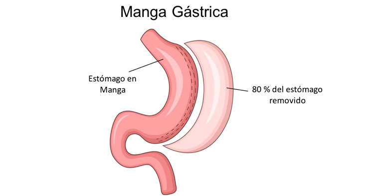 La manga gástrica es una cirugía restrictiva en la que se disminuye el tamaño del estómago, creando uno nuevo con capacidad de 100 ml, se extrae de un 65 al 80% del estómago, la parte que se extrae de estómago es la encargada de secretar la hormona del hambre, de esta manera se restringe la cantidad de alimento que se ingiere y al mismo tiempose elimina la producción de la hormona del hambre.